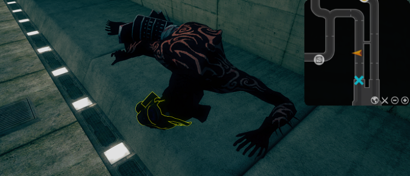 Use the [Korinto-kai weapon] (190,330) beside the Korinto-kai corpse in the unfinished electrical grid platform of Orochi Underground - Section 008A.