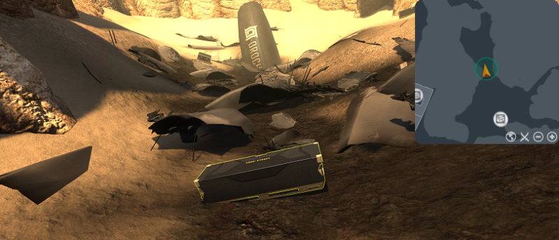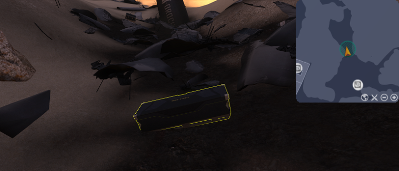 Follow the trail of debris from the cockpit to the still-intact turbine plane to find scattered Orochi cargo crates. In the remains of the fuselage (625,1105) is one particular [Orochi cargo crate] of interest. Use the [Orochi cargo crate] in the center of the debris. Doing so will complete the goal and result in a FIFO On-Screen Message.