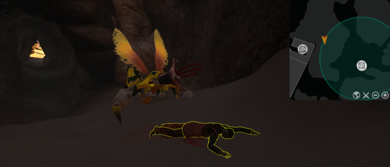 Follow the trail of blood leading West-North West away from the cockpit and toward a small tunnel (610,1050). In the far back of the cavern rests the blood-smeared body of the [Orochi first officer] (580,1085). A Sandhorror locust had dragged the poor soul inside. Examine the [Orochi first officer] to retrieve the second keycard.