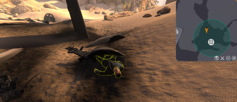 A parachute is impaled on the cliff to the East of the cockpit. Beneath it lies the corpse of the [Orochi pilot] (705,1040), who tragically did not survive his parachute getting caught or the locusts around him as he fell. Examine the [Orochi pilot] to retrieve the first keycard.
